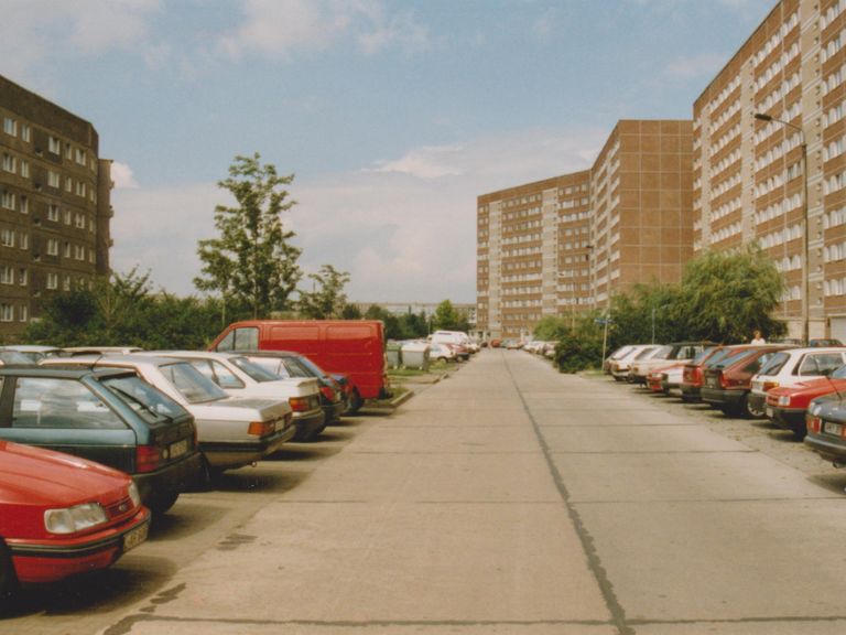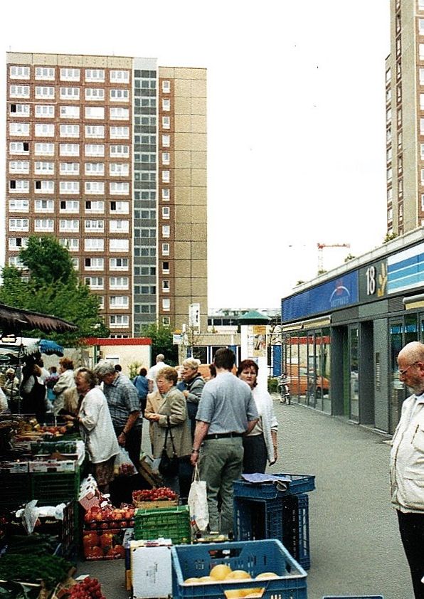 Rechts: 11-geschossige Bauten mit WBS 70 der Neuen Leipziger Straße (ca. 2006 ersatzlos abgerissen)