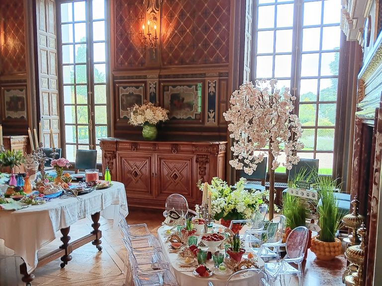 prachtvoll kostümierten und maskierten Paare eines Festzuges bestaunen und fotografieren. Nachdem sich die Masken zu einem bunten Bild auf der Freitreppe des Schlösschens aufgestellt und danach zum Flanieren im Park zerstreut haben, erhalten wir Gelegenheit, die Interieurs des Schlösschens zu besichtigen. Die Räume sind relativ klein, thematisch gestaltet und farblich aufeinander abgestimmt – ein wahres Fest barocker Lebenslust! (2024)